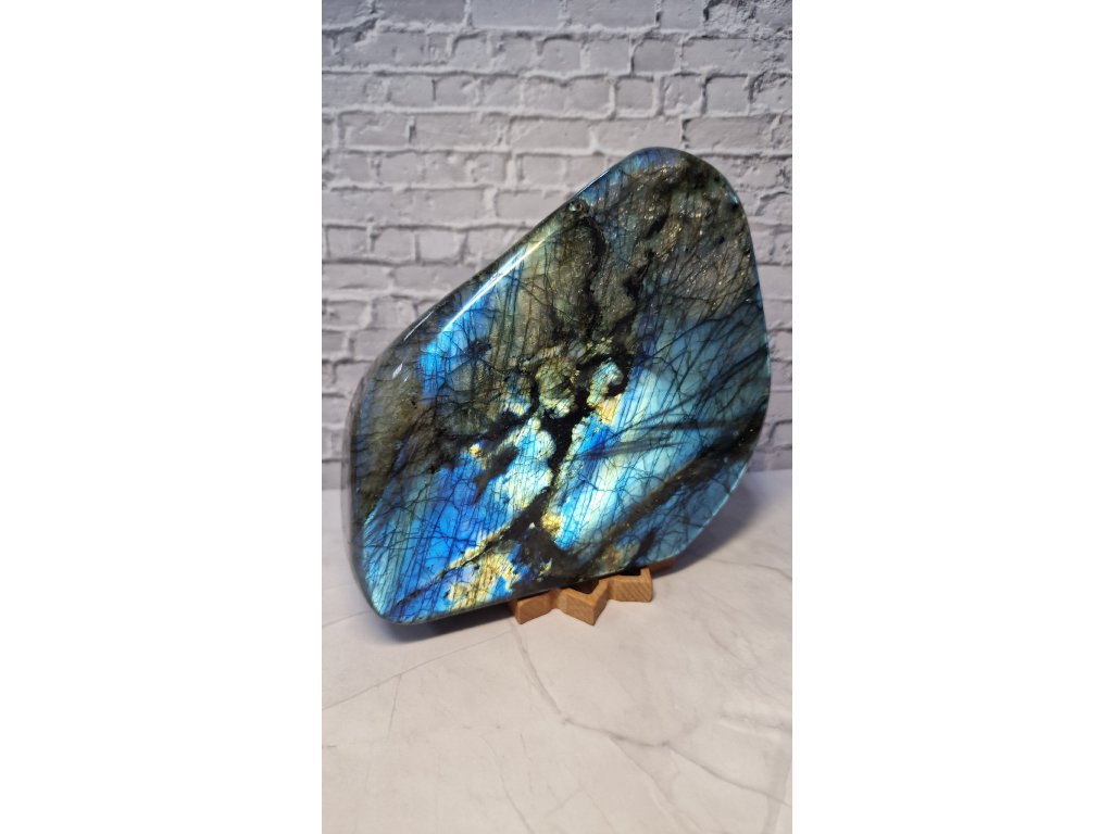 Labradorit s modro - žltými odleskami. Samostatne stojací. Váha 1,35 kg, rozmery 14,5 cm x 9 cm x 4 cm. Kupujete priamo tento ks. Krajina pôvodu Madagaskar.