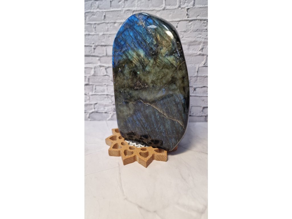 Labradorit s modro - žltými odleskami.  Samostatne stojací. Váha 1,35 kg, rozmery 14,5 cm x 9 cm x 4 cm. Kupujete priamo tento ks. Krajina pôvodu Madagaskar.