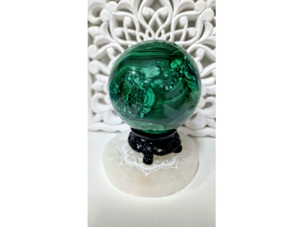 Malachitová guľa, bez podstavca, váha 1,07 kg, priemer 7,5 cm. Krajina pôvodu Kongo. Kupujete priamo tento ks.