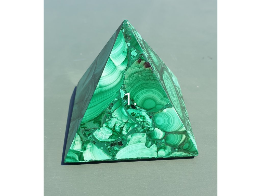 Malachitová pyramída, rozmery 5x5 cm. Krajina pôvodu Kongo.