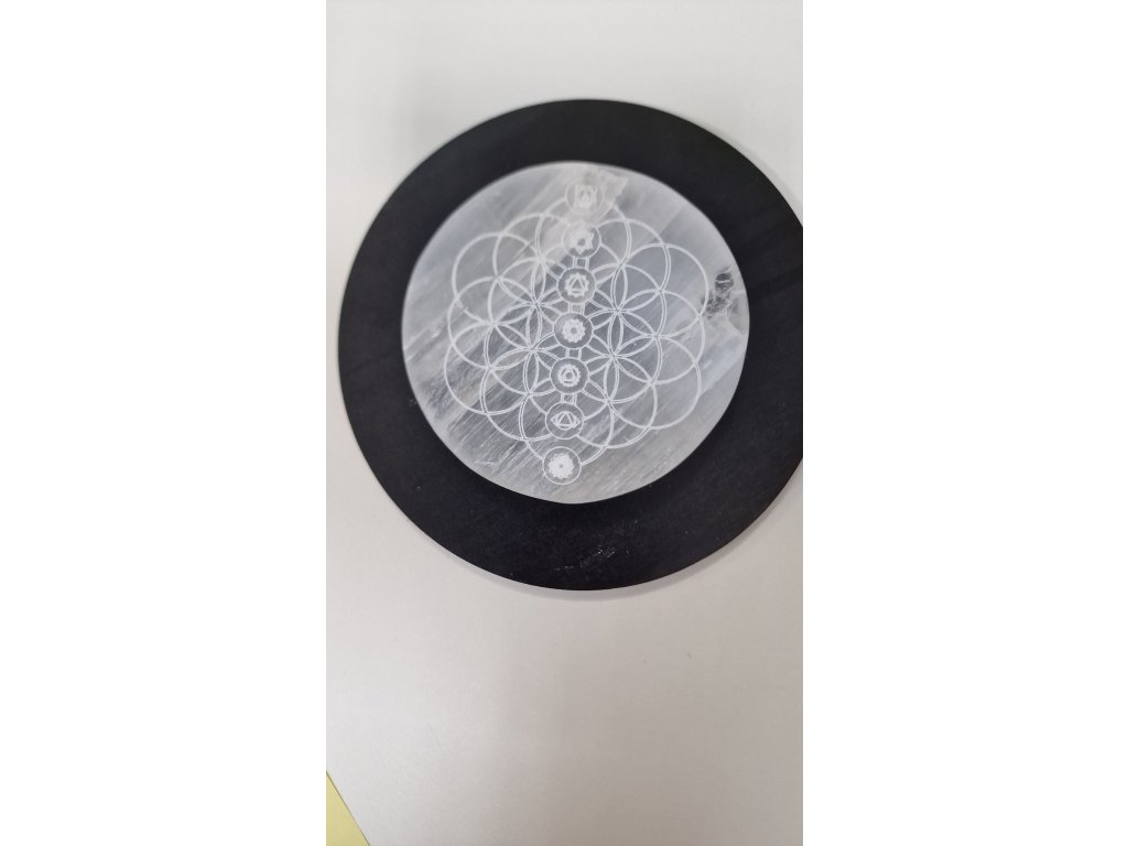 Selenitová podložka kvet života a čakry, veľkosť 10 cm,   je ručne vyrezávané, oceníte najmä zmysel pre detail. Vhodná do priestoru, prikladanie na telo a tiež do kyštálových mriežok na ukladanie menších kamienkov. Môžete použiť ako podložku pod pohár. Vhodná aj na prácu s kyvadlom. Harmonizuje a navyšuje energiu. Krajina pôvodu Maroko.