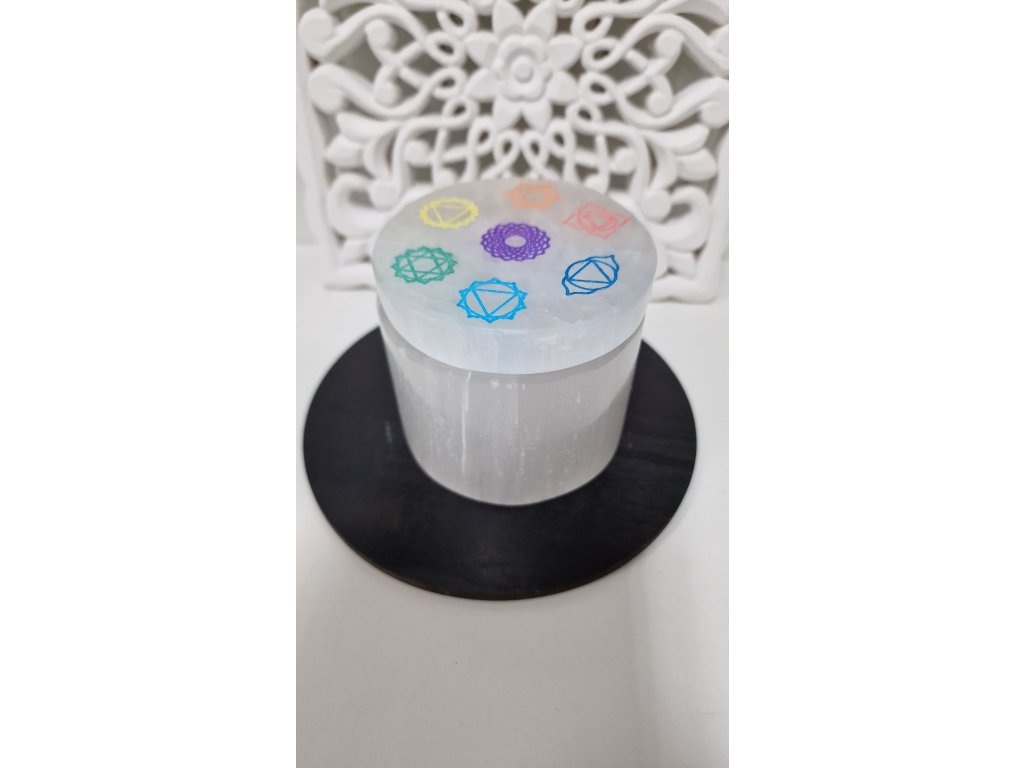 Selenitová uzatvárateľná nádoba  čakra, vonkajší priemer  8,5 cm,    vnútorný 6 cm,  výška s vrchnákom 8 cm. Vhodná do interiéru, aj ako svietnik, prípadne na uskladnenie drobných predmetov, šperkov,  kamienkov.  Harmonizuje a navyšuje energiu. Krajina pôvodu Maroko.